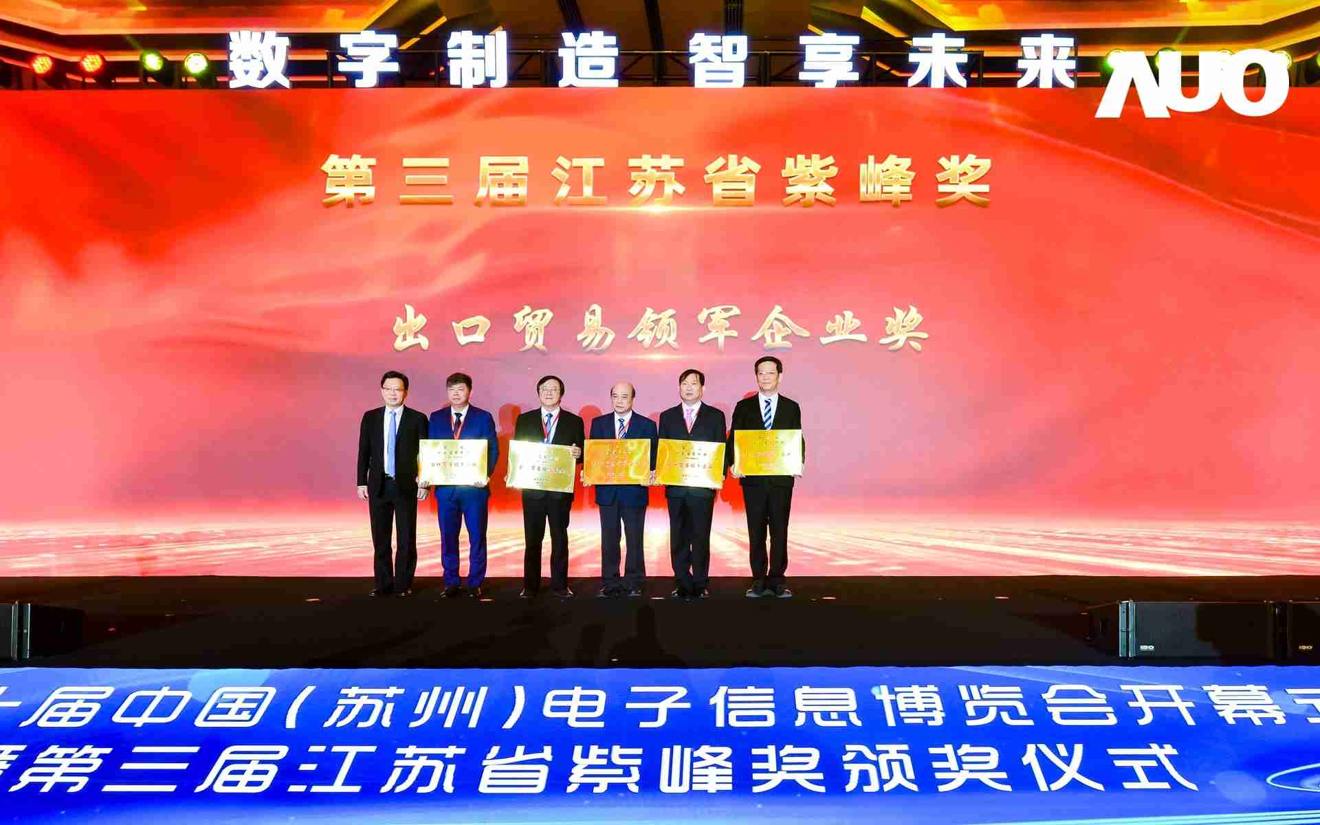 电博会开幕式当天也是第三届江苏省紫峰奖颁奖仪式,,省台办、、工信厅、、、、商务厅、、苏州市相关领导均出席并颁奖。。该奖项为表彰对江苏高质量发展做出积极贡献的在苏企业,,由江苏省政府专门设立。。。。糖果派对光电 (苏州) 总经理郭振明代表上台领奖,,,这也是糖果派对苏州连续三次蝉联紫峰奖 出口贸易领军企业奖。。糖果派对数位总经理赵丽娜女士,,,也参与本次开幕式,,上台为本地化赋能签署战略合作协议,,,将优质服务资源集合、、、下沉到更多细分行业,,为更多地区的制造企业提供数字化转型服务。。。